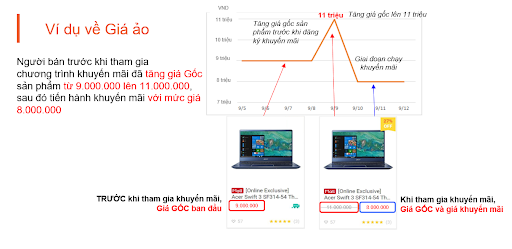 Chiến lược bán hàng “ảo giá” không chỉ xuất hiện ở các cửa hàng bán hàng trực tiếp mà còn xuất hiện tại sàn thương mại điện tử. Tháng 4/2023, Shopee ngay lập tức đăng tải chính sách mới về vi phạm bán giá ảo. Nội dung của chính sách nói tới việc người bán hàng tăng giá để tham gia chiến dịch khuyến mãi là hành động vi phạm, bị coi là “tăng giá ảo”.