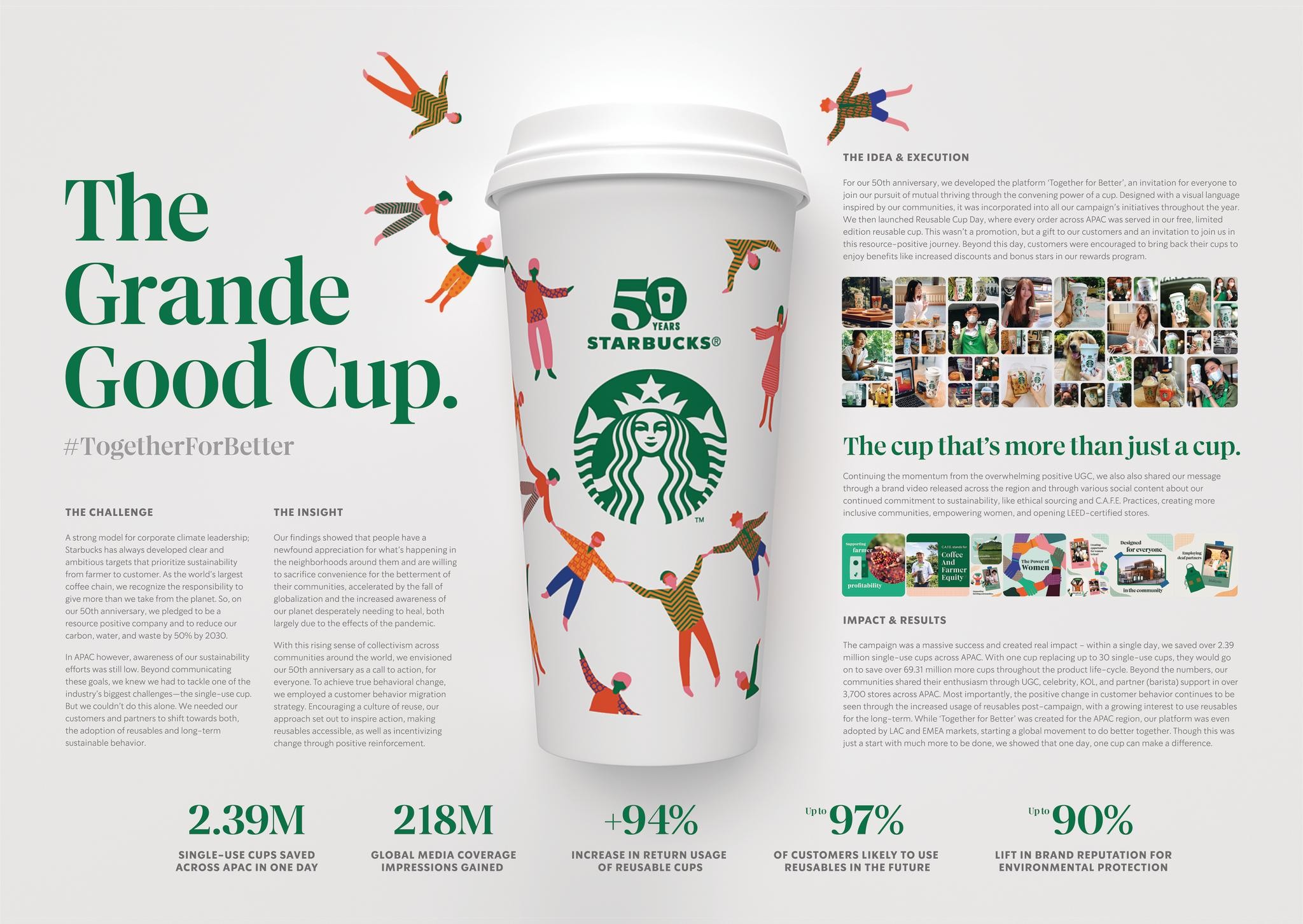 Tại Starbucks, thương hiệu này đã đưa được triết lý kinh doanh bền vững vào hoạt động kinh doanh thường ngày. Ví dụ việc sử dụng bã cà phê để đóng thành bàn ghế hay các họa tiết trang trí trong cửa hàng, ly đựng sử dụng giấy tái chế, hay hoạt động chiết khấu trên sản phẩm bán khi người tiêu dùng mang theo ly riêng của họ để sử dụng tại cửa hàng. Đáng chú ý, cộng đồng những người hâm mộ Starbucks trên toàn cầu luôn được khuyến khích đóng góp những ý tưởng để giúp hoạt động kinh doanh của Starbucks ngày càng thân thiện hơn với môi trường.
